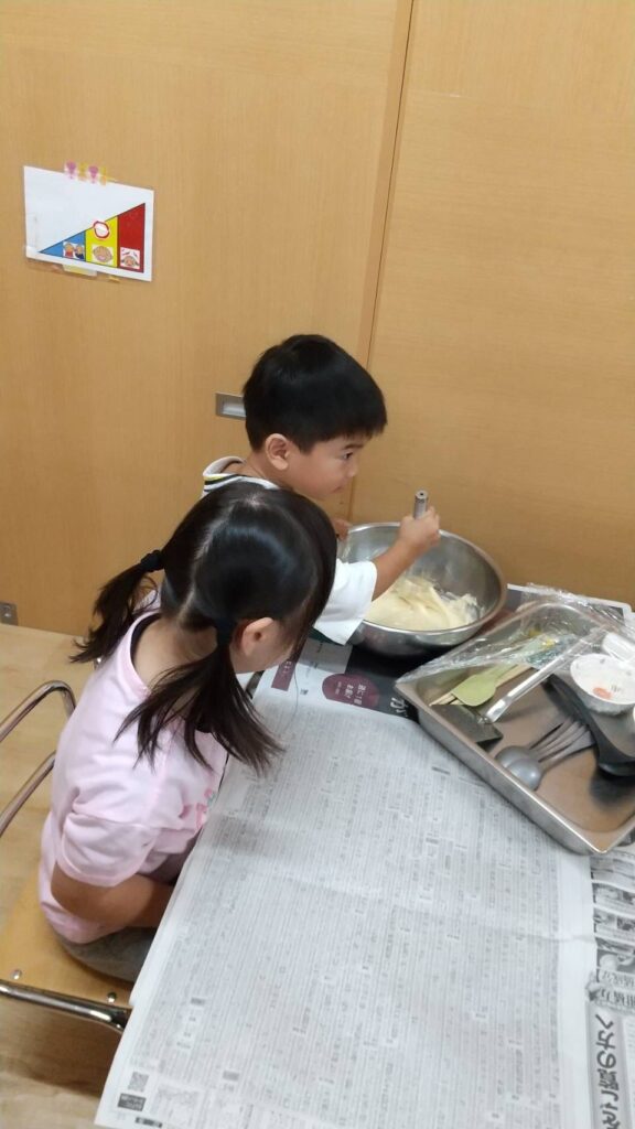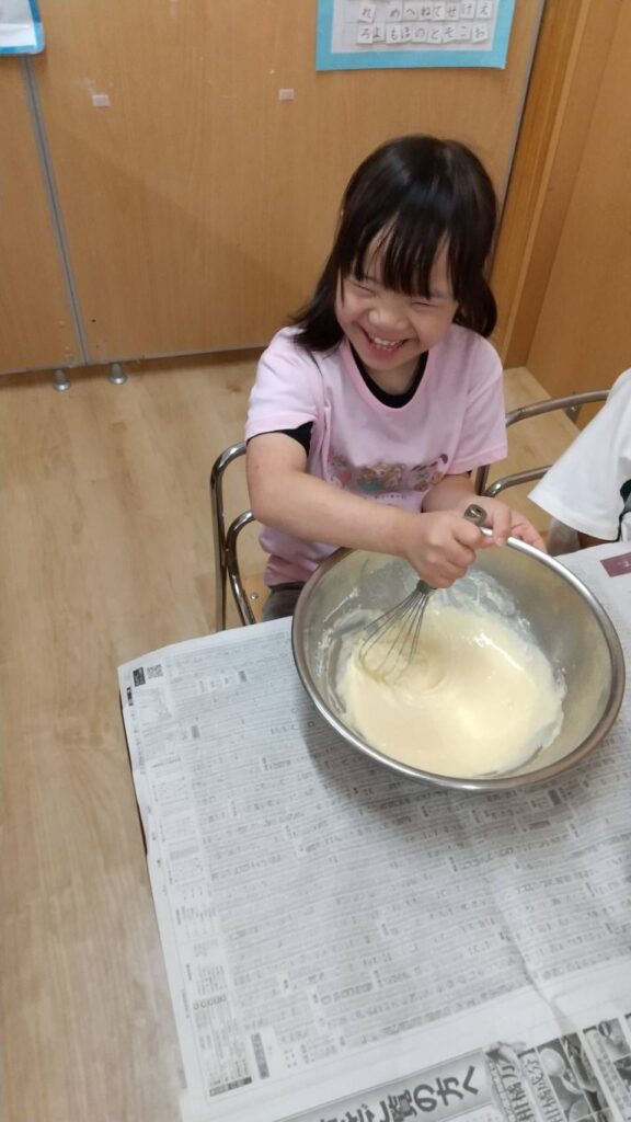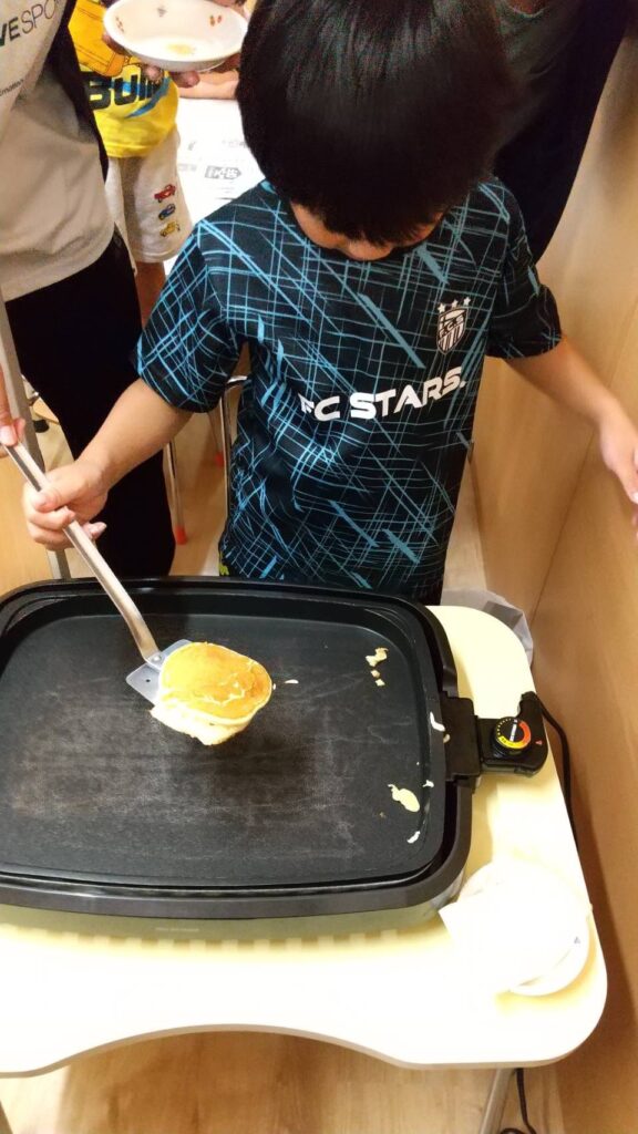 児童発達支援センターくるーるです。生地を混ぜて焼いてホットケーキを作っています。焼いているときは焦げないようにしっかり見ながら焼いています!上手にひっくり返し返せたときにはとてもいい笑顔でした