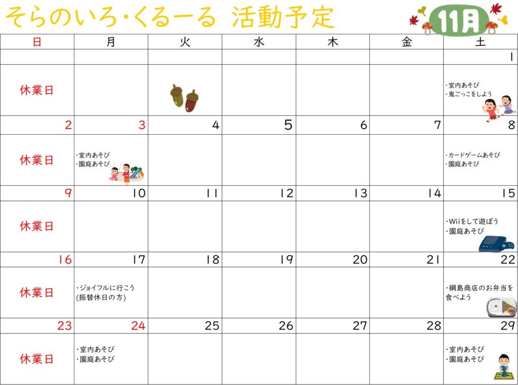 児童発達支援センターくるーる 5月の予定です。外遊びが気持ち良い季節になり、お子さんたちも外で元気に走り回っています。くるーるでは8日に子どもの日の行事を行います。お子さんたちが毎日元気に過ごせますように。